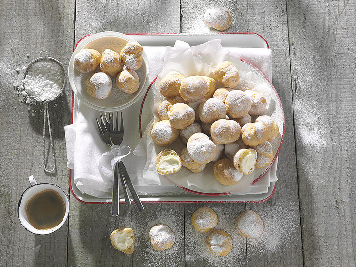 Ursprünglich ein Geschenk der französischen Küche, begeistern die klassisch aus Brandteig hergestellten Mini-Windbeutel bis heute. Gefüllt mit leicht gesüßter Sahnecreme, sind sie nach dem Auftauen und Bestäuben mit dem beigelegten Dekorpuder sofort servierfertig. Im Sommer schmecken sie halbgefroren oder als Dessert auf einer Fruchtgrütze aus süßen Beeren besonders köstlich.