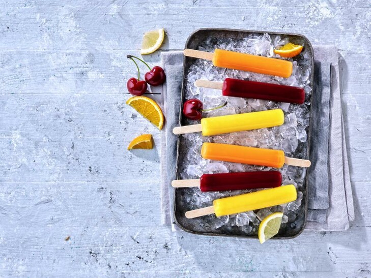 Fruchteis Zitrone, Orange und Kirsche.
