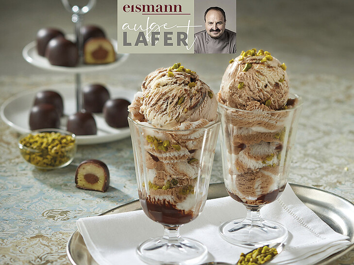 Feine Mandeleiscreme und vollmundige Eiscreme Haselnussgeschmack verstrudelt mit Schokosauce und Pistazienstücken. Für den besonderen Kaffeehaus Eis Moment nach Salzburger Art.