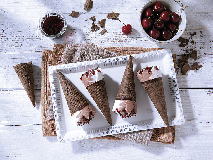 Die Schwarzwälder Torte, eine der bekanntesten Torten, kann man bei uns im Eisformat genießen. Cremiges Eis Kakaogeschmack und Eis Vanillegeschmack ist bis in die Spitze mit einer fruchtig-säuerlichen Sauerkirschsauce verstrudelt. In ein knuspriges Kakao-Waffelhörnchen gefüllt, wird das Eis klassisch mit Sauerkirschsauce und vielen knackigen Schokoladenstückchen dekoriert. Eine kühle Erfrischung für die ganze Familie, denn unser Hörnchen enthält extra keinen Alkohol.
