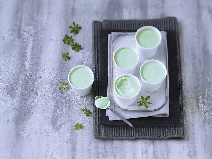 Ein Geschmack aus der Kindheit: Cremiges Eis Waldmeistergeschmack mit feiner Waldmeisternote. Genieße dieses vollmundige Eis pur gleich aus dem vorportionierten Becher oder portioniert auf frischen Erdbeeren oder einem Stück Obstkuchen.