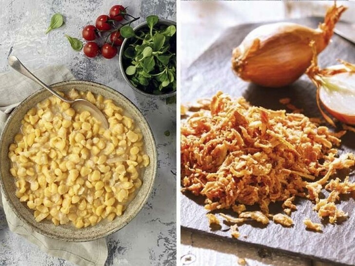 KÄSEKNÖPFLE - Geschmackvoller Genuss für die ganze Familie: Gegarte saftige Eierknöpfle in würzig-cremiger Sahnesauce. In handwerklicher Optik mit Zwiebeln, Emmentaler & Bergkäse verfeinert. Als klassische Beilage zu Fleischgerichten oder eine herzhafte Hauptmahlzeit sind die küchenfertigen Käseknöpfle vielseitig einsetzbar und sorgen nicht nur bei Vegetariern für kulinarische Abwechslung. RÖSTZWIEBELN - Ohne viel Aufwand und mit der feinen Schärfe von Haushaltszwiebeln. Knusprig, aber nicht fettig im Geschmack, passen sie nicht nur perfekt zum Hotdog, sondern verfeinern auch Pürees oder ein Hacksteak auf brillante Weise. In der praktischen Aromadose lassen sie sich ideal portionieren.