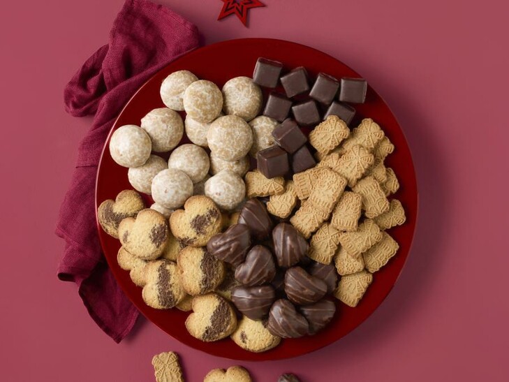 Gebäckmischung aus Mini Gewürzspekulatius (Spekulatius mit weihnachtlichen Gewürzen), Lebkuchenknöpfen (Brauner Lebkuchen mit 17% weißer Zuckerglasur), Dominosteine (Dominosteine mit 20% Persipan, 38% Fruchtfüllung und 25% Zartbitterschokolade), Kirsch-Lebkuchen Herzen (Lebkuchen mit 18% Apfel-Kirschfruchtfüllung, umhüllt von 28% Zartbitterschokolade und dekoriert mit 2% Vollmilchschokolade). Marmorherzen (Mürbegebäck in Herzform mit Kakao durchzogen).