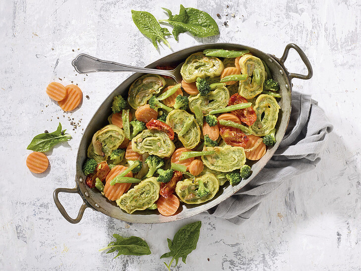 Himmlischer Genuss aus bodenständiger Küche: Gerollte, aufgeschnittene Maultaschen, prall gefüllt mit würzigem Schweinefleisch und Spinat. Dazu eine bunte Gemüsemischung aus Broccoli, Möhren, Zwiebeln, getrockneten Tomaten und Bohnen. In der Pfanne gebraten, zeigt diese Kombination, dass meistens die traditionellen Gerichte aus heimischen Küchen die höchste Zufriedenheit und den größten Genuss liefern.