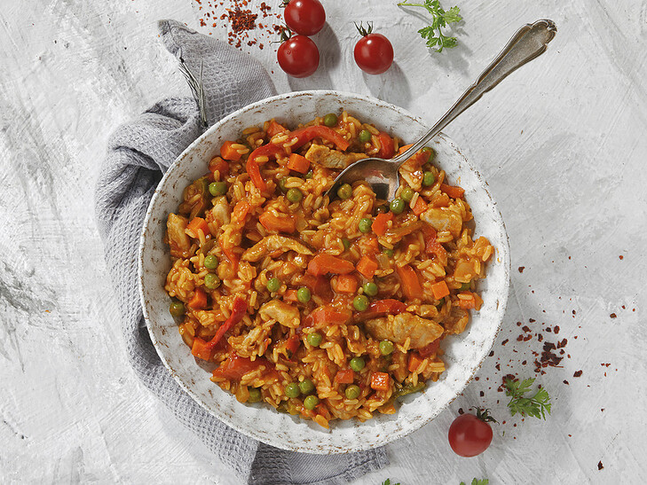 Herzhaft gewürzte Reispfanne mit klassischer Geschmackskomposition: Bissfester Langkornreis, gewürztes, zart gegartes Schweinefleisch und eine bunte Mischung aus Paprika, Tomaten, Zwiebeln, Erbsen und Möhren vereinen sich hier zu einem beliebten Gericht für alle Altersgruppen. Die würzig-rauchige Tomatensauce rundet den Genuss perfekt ab.
