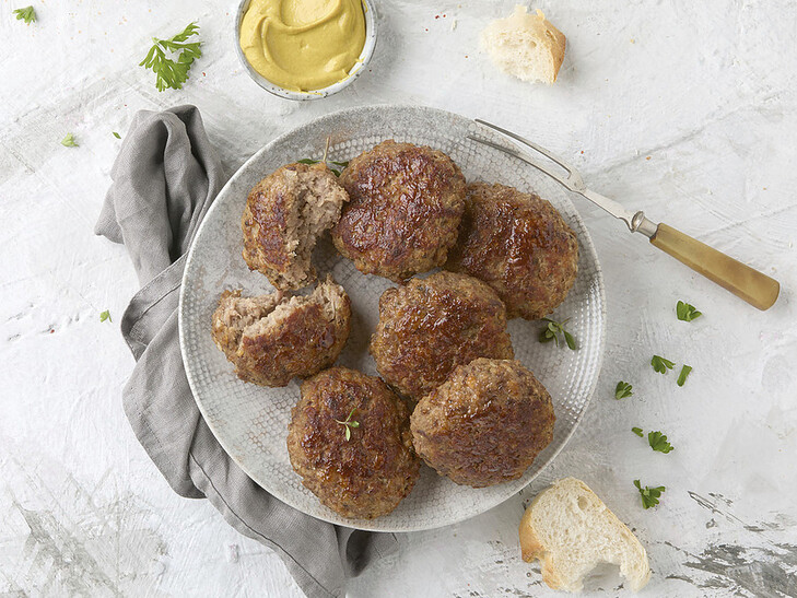 Aus Rind- und Schweinefleisch, herzhaft gewürzt, gebraten.