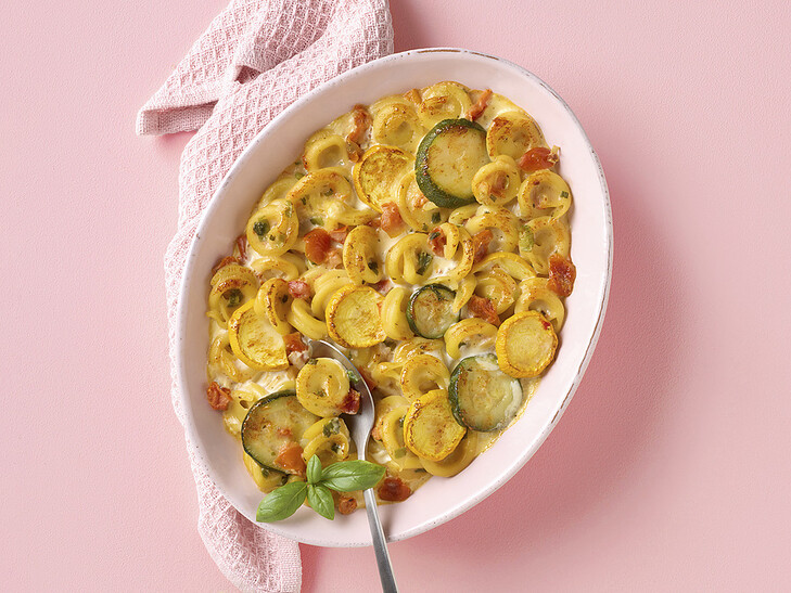 Ein ofenfertiges Nudelgratin, das alles mitbringt, was ein gutes Ofengericht ausmacht: Fein gewalzte, al dente vorgekochte Trullinudeln verbinden sich mit einer bunten Gemüsekomposition aus grüner und gelber Zucchini, getrockneten und frischen Tomaten sowie feinen Frühlingszwiebeln. Umhüllt von einer milden, cremigen Sauce und verfeinert mit würzigem Käse entsteht ein ausgewogenes Gratin, das die ganze Familie begeistert. Ideal als Hauptgericht oder Beilage, schnell im Ofen zubereitet – und gleichermaßen beliebt bei großen wie kleinen Genießer:innen. Tipp: Teste die Zubereitung auf dem Herd und verwandle das Gericht in eine cremige Nudelpfanne!