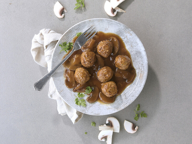 Herzhafte Fleischklößchen in cremiger Sauce mit Champignons. Tiefgefroren.