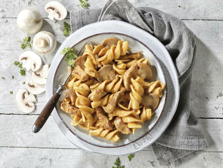 Champignons (32%), gegarte Nudeln (30%) (Wasser, Hartweizengrieß) , gegartes, gewürztes Schweinefleisch (12%) (Schweinefleisch (94%)1, Kartoffelstärke, jodiertes Speisesalz (Speisesalz, Kaliumjodat), Säureregulator Natriumcitrate; Dextrose, Rosmarin, weißer Pfeffer, Rapsöl) , Wasser, Sahne (5 %), Geflügelfond (Wasser, Geflügelextrakt (Pute, Huhn)), Zwiebeln, Sellerie, jodiertes Speisesalz (Speisesalz, Kaliumjodat), modifizierte Maisstärke, Tomatenmarkkonzentrat , Senf (Wasser, Senfsamen, Branntweinessig, Speisesalz, Gewürze, Zucker) , Weizenmehl, Rapsöl, Zucker, Karamellzuckersirup , Knoblauch, weißer Pfeffer, schwarzer Pfeffer, Liebstöckel , Geflügelfett (Pute, Huhn), Kann Spuren von Eiern, Soja enthalten., 1 entspricht 11,3 % bezogen auf das Gesamterzeugnis