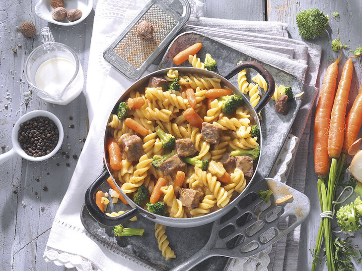 Ihr Name ist Programm. Wie nach Muttis Lieblingsrezept zubereitet ergibt der gelungene, mit Weißwein verfeinerte Mix aus Spirelli-Nudeln, zarten Rindfleischstückchen in mundgerechter Größe und buntem Gemüse ein herzhaftes Pfannengericht. Beliebig portionierbar lässt es sich in wenigen Minuten ohne Aufwand zubereiten.