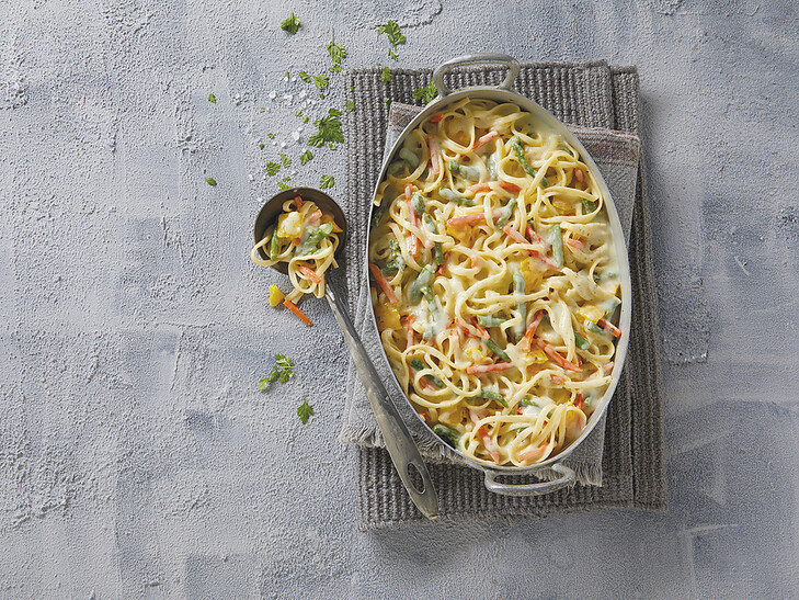Linguinenester mit grünen Spargel-, Karotten- und gelben Paprikastücken, verfeinert mit einer cremigen Sauce. Tiefgefroren.