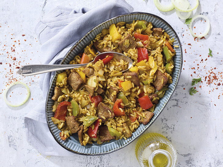 Ein herzhaftes Pfannengericht mit Reis, gegartem und geschnittenem Schweinefleisch, bunter Paprika, Zwiebeln und Weißkohl, pikant nach griechischer Art gewürzt und äußerst flexibel in seiner Präsentation. Solo als Hauptgericht, mit knusprigem Fladenbrot und Tzatziki, zu einem leichten Salat mit Oliven, Feta und Zitronenspalten oder als knackige Wrapfüllung - dieses Gericht erinnert immer an entspannte Abende in einer griechischen Taverne und mit einem Glas Wein genossen, zeigt es die zeitlose Beliebtheit der mediterranen Küche.