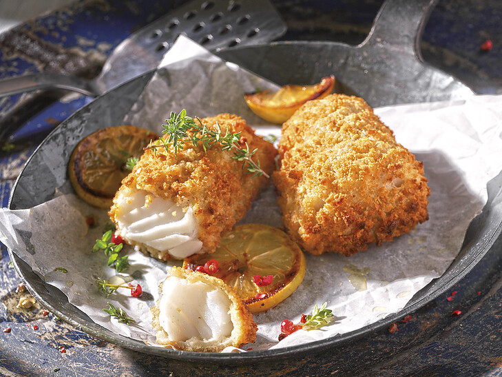 Kabeljaufiletportionen, praktisch grätenfrei, in einer knusprigen Panade, vorgebraten. Tiefgefroren.