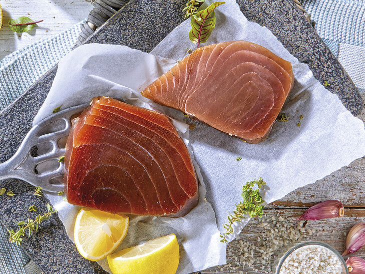 Gleichgroße Steaks vom Thunfisch, die ohne Haut und praktisch grätenfrei für die mühelose Zubereitung vorbereitet sind. Mit dem Geschmack wie zartes Kalbfleisch und dem mild salzigen Aroma ist der Thunfisch in wenigen Minuten in der Pfanne oder auf dem Grill zubereitet.