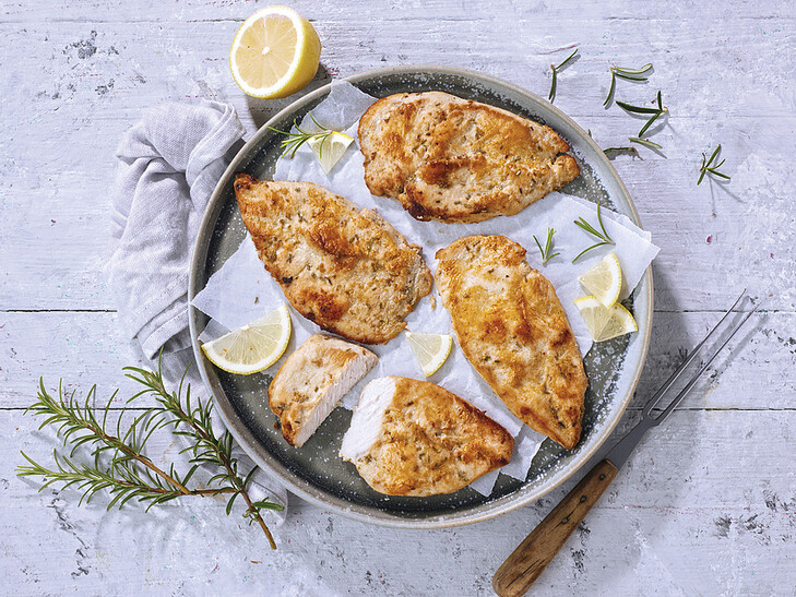 Schneller als ein Butterbrot geschmiert sind diese dünnen saftigen Minutensteaks gegrillt. Aus dem zarten Hähnchenbrustfilet geschnitten und bereits flüssig gewürzt überzeugen die Steaks mit einer Marinade aus Rosmarin und Zitrone. Ideal im Sommer direkt vom Grill genießen oder als Sandwich fürs Büro mitnehmen. Klassisch als Hauptgericht mit knackigem Gemüse aus unserem Sortiment anrichten.