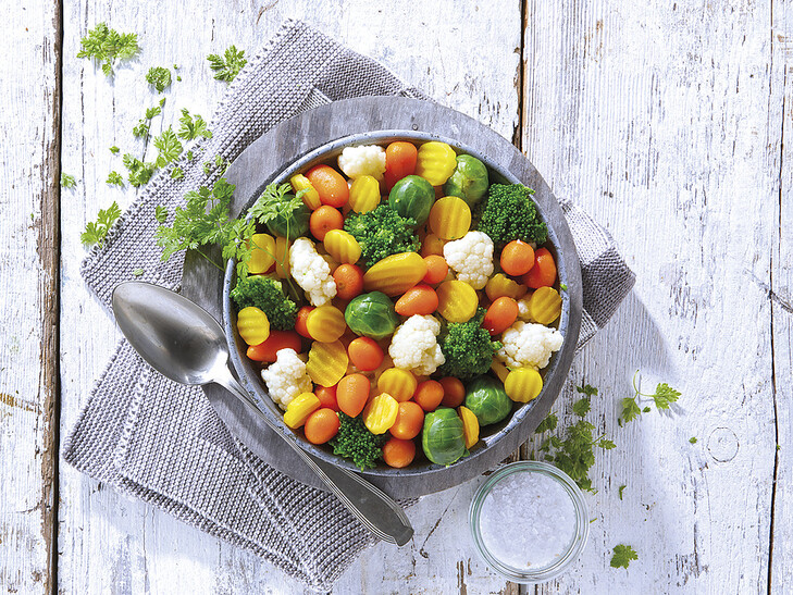 Farbenfrohe Mischung beliebter Gemüse wie kleine Pariser Karotten, gelbe Karotten, Blumenkohl- und Broccoli Röschen sowie zartem Rosenkohl. Der Gemüsemix ist ungewürzt und kann individuell zubereitet werden. Einfach in Butter schwenken und mit Muskat würzen und zu einem Schnitzel oder einer Bratwurst servieren.