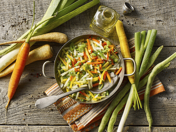 Super fein inJulienne- Streifen geschnitten, individuell zu entnehmen: Karotten, Pastinaken, Bohnen, Porree & Frühlingszwiebeln. Ungewürzt zu verwenden, probieren Sie es als Gemüsebett für Fischfilet, Gemüsepfanne mit Hähnchenbrust oder einfach asiatisch im Wok mit Garneln.
