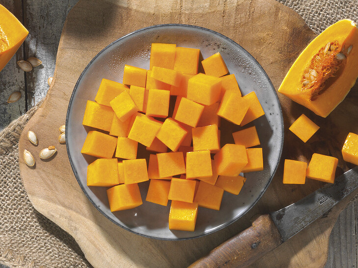 Kürbis in Würfel geschnitten, beliebig portionierbar. Tiefgefroren.