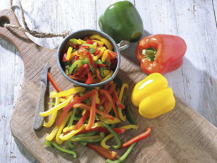 Dünn geschnittene bunte Paprikastreifen, einfach soviel nehmen, wie man gerade braucht. Knackige Zutat für einen Salat, in der asiatischen Küche, für viele Pfannengerichte oder mit Schafskäse im Backofen gratiniert.