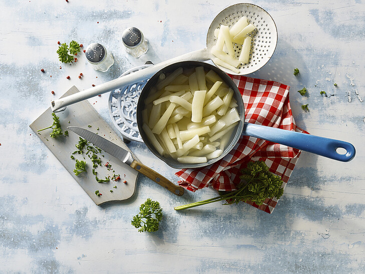 Das beliebte Wurzelgemüse aus dem Erdreich: Sorgfältig geputzte und blanchierte weiße Schwarzwurzelstücke. Zart und cremig schmelzend im Geschmack. Ein Edelgemüse, das sehr gut zu einem gebratenen Steak oder zu einem gedünstetem Fischfilet passt. Mit Butter, etwas Salz und einer Prise Muskat würzen.