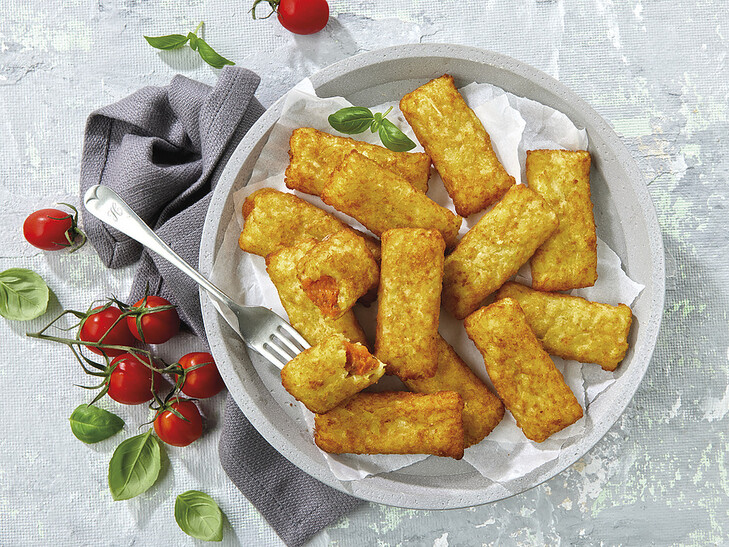 Mini Taschen aus frisch geraspelten Kartoffeln mit cremiger Füllung aus Mozzarella und Tomaten, mit mediterranen Kräutern verfeinert. Vorgebacken. Tiefgefroren.
