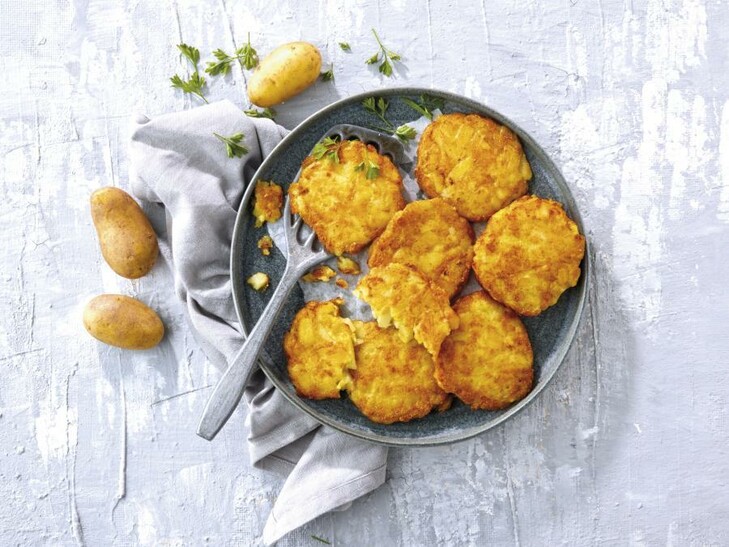 Kartoffelplätzchen aus geraspelten, blanchierten Kartoffeln. Vorgebacken. Tiefgefroren.
