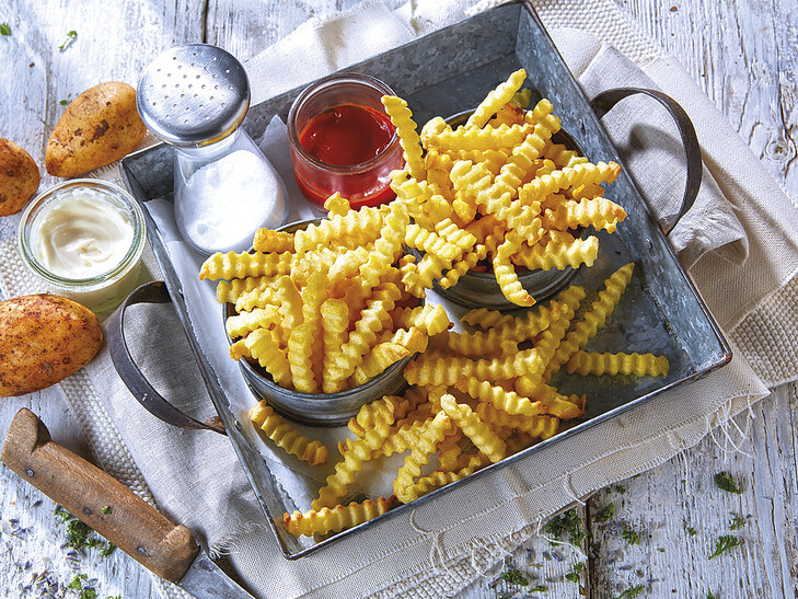 Die Heißluft-Fritteuse auf 180° C vorheizen. Zick-Zack-Pommes tiefgefroren in Fritteusenkorb legen und ca. 13 Minuten frittieren. Für ein gleichmäßiges Ergebnis Zick-Zack-Pommes nach der Hälfte der Zubereitungszeit einmal durchschütteln. Die empfohlene Zubereitungszeit bezieht sich auf 200g.