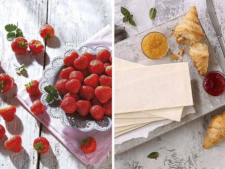 ERDBEEREN - Vollreife, süße Erdbeeren der Sorte Senga Sengana – saftig und aromatisch wie frisch gepflückt. Die Früchte sind erntefrisch tiefgefroren und jederzeit einsatzbereit. Ideal zum Backen, als Dessert oder für Smoothies. Einfach auftauen und wie frische Beeren verwenden. BLÄTTERREIG - Locker, luftig, leicht und herrlich blättrig – so kommt perfekter Blätterteig aus dem Ofen. Die fertig vorbereiteten Scheiben lassen sich nach nur 30 Minuten Antauen auf einer bemehlten Arbeitsfläche weiterverarbeiten. Im Handumdrehen entstehen süße Windmühlen, Fruchtteilchen, Käsegebäck oder feine Pasteten. Jedes Gebäck gelingt schnell und mühelos.