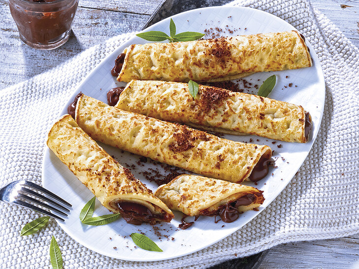 Ein absolutes Muss für echte Nougat-Liebhaber: Feine Mini-Pfannkuchen exquisit von Hand gerollt, mit einer saftigen Nuss-Nougat-Creme gefüllt. Ob schnell für zwischendurch oder mit Früchten serviert immer eine Besonderheit!