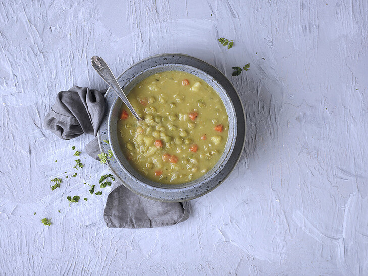 Einer der beliebtesten Eintöpfe: Aus geschälten- und ungeschälten Erbsen mit Kartoffelwürfeln & Suppengrün und feiner leichter Räucher-Specknote.