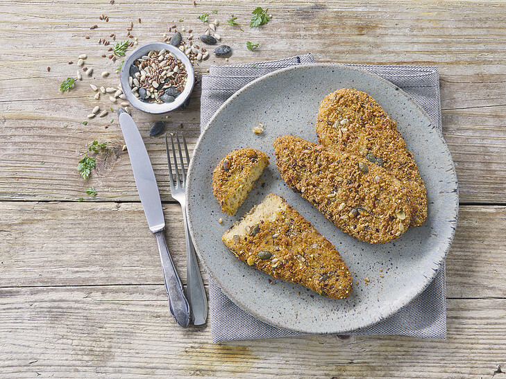 Saftige Schnitzel sind bei fast jedem beliebt. Damit alle zugreifen können, bietet eismann eine köstliche Alternative für alle, die auf Fleisch verzichten: das vegane Schnitzel auf Weizenprotein-Basis. Würzig im Geschmack und umhüllt von einer knusprigen Panade aus Lein- und Mohnsamen, Kürbis- und Sonnenblumenkernen sowie Hirse. Perfekt in der Pfanne gebraten – ideal mit gebratenen Champignons oder einer bunten Gemüsemischung.
