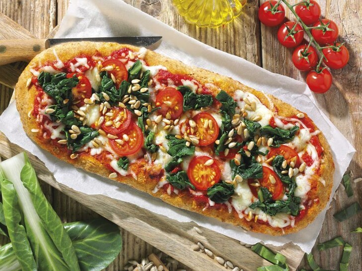 Pizza aus Weizenvollkornmehl belegt mit Tomatensoße, Mozzarella (10%),Tomaten (9%), Mangold (5%) und mit Sonnenblumenkernen (3%) abgestreut. Tiefgefroren
